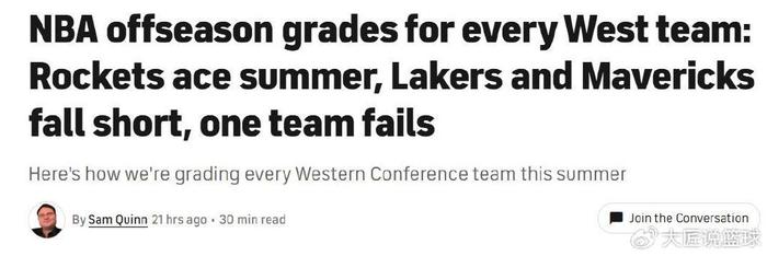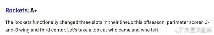 火箭队获A+高评分!在休赛期第一波大幅度引援与签约结束后,美媒《cbs sports》根据各支球队操作公布西部15队休赛期至今操作评分,其中快船获B评分,湖人队只得到C-,同时仅勇士一支球队评分待定。