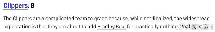 加上领跑保罗与比尔争夺战,如果快船队最终可以拿下两人,或者至少拿下比尔,他们的评分就将进一步提升至B+。